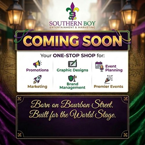 "At Southern Boy Entertainment & Marketing, our mission is to bring Southern heart to the world stage. Rooted in the rich traditions of hospitality, craftsmanship, and community that define the South, we are the one-stop shop delivering exceptional graphic design, marketing, promotions, brand management, event planning, and premier events to businesses and clients worldwide. We treat every client like family, every brand like a legacy, and every project like a celebration — because where we come from, that's just how good work gets done. Born on Bourbon Street. Built for the World Stage."project we undertake."